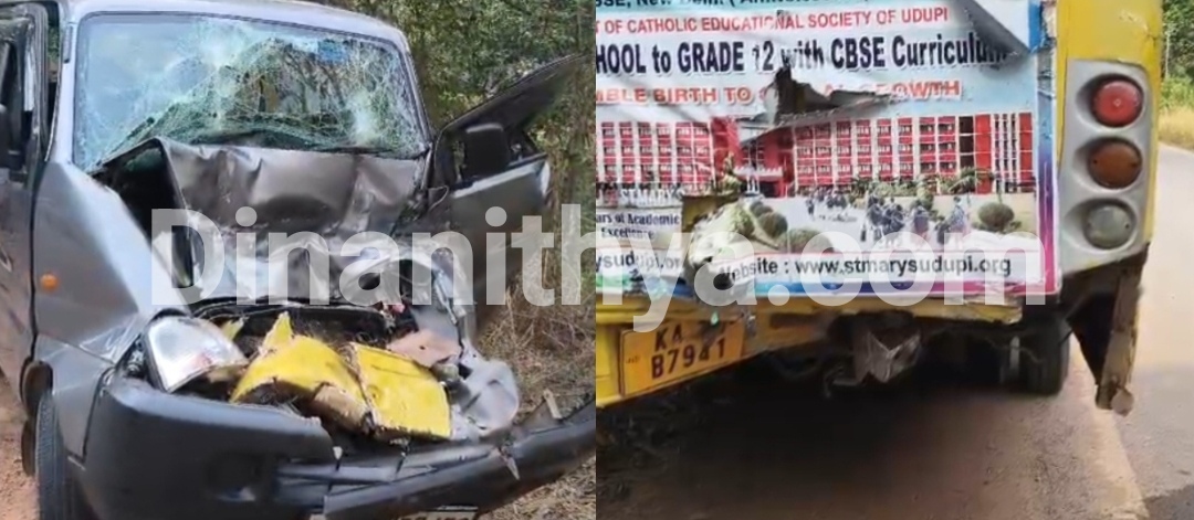 ಶಾಲಾ ಬಸ್ ಮಣಿಪುರ ಕಡೆಗೆ ತೆರಳುತ್ತಿದ್ದು, ಈ ವೇಳೆ ಹಿಂಬದಿಯಿಂದ ಬಂದ ಇಕೋ ಕಾರು ಡಿಕ್ಕಿ ಹೊಡೆದಿದೆ. ಇದರಿಂದ ಕಾರಿನಲ್ಲಿದ್ದ ತಂದೆ ಹಾಗೂ ಮಗನಿಗೆ ಗಂಭೀರ ಗಾಯವಾಗಿದ್ದು, ಅವರನ್ನು ಉಡುಪಿಯ ಖಾಸಗಿ ಆಸ್ಪತ್ರೆಗೆ ದಾಖಲಿಸಲಾಗಿದೆ. ಡಿಕ್ಕಿ ಹೊಡೆದ ರಭಸಕ್ಕೆ ಕಾರಿನ ಮುಂಭಾಗ ಸಂಪೂರ್ಣ ಜಖಂಗೊಂಡಿದೆ. ಪೊಲೀಸರು ಸ್ಥಳಕ್ಕೆ ಆಗಮಿಸಿ ಪರಿಶೀಲನೆ ನಡೆಸಿದರು.
